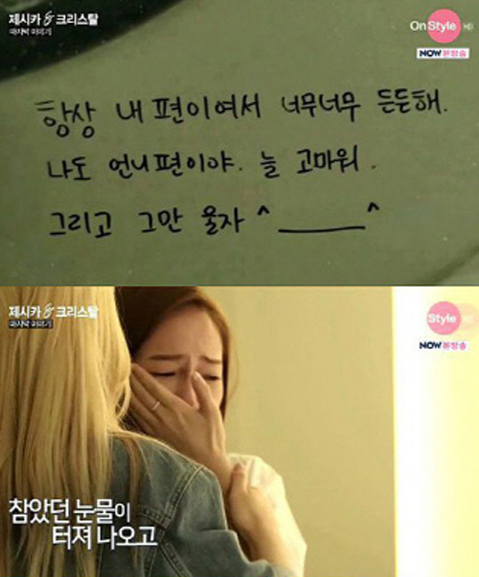 크리스탈은 지난 8월 종영된 온스타일 '제시카&크리스탈' 마지막 회에서 언니를 위한 이벤트를 마련했다. '제시카&크리스탈'에 얽힌 추억들이 담긴 사진들을 정리해 보여준 것. 이에 제시카는 눈물을 펑펑 쏟아냈다.