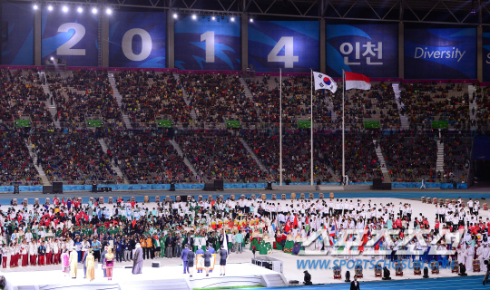 4일 오후 인천아시아드 주경기장에서 2014 인천 아시안게임의 폐막식이 열렸다. '평화의 물결, 아시아의 미래'라는 슬로건을 내걸고 16일간의 열전을 거듭한 '제17회 인천 아시안게임'이 인천아시아드주경기장에서 열리는 폐회식을 끝으로 대단원의 막을 내렸다. 한국은 수영과 육상, 야구와 축구 등 36개 종목에서 열전을 벌인 가운데 총 금메달 79개을 획득해 5회 연속 종합 2위를 수성하며 목표를 달성했다. 폐막식에서 태극기와 다음 개최지인 인도네시아의 국기가 동시에 계양되있다. 인천= 김경민 기자 kyungmin@sportschosun.com