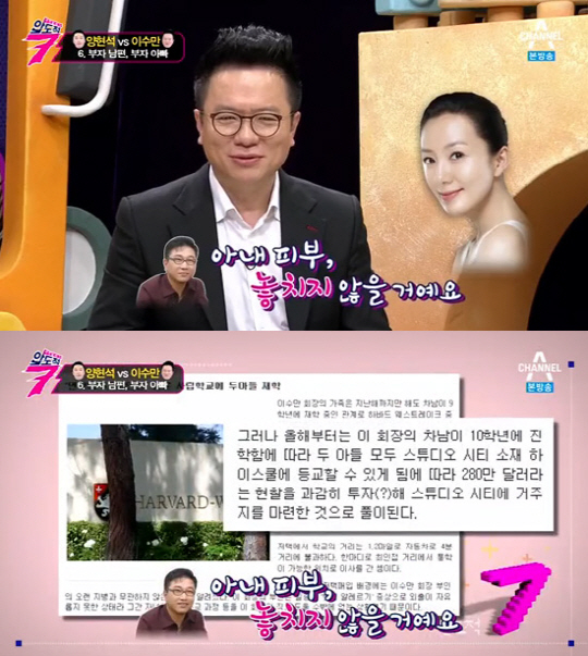 계속해서 그는 "이에 가만히 있을 수 없었던 이수만 씨가 '아내 피부 놓치지 않을 거에요'라며 둘째 아들이 첫째 아들과 같은 고등학교에 진학하자마자 학교 근처에 280만 달러 상당의 대저택을 구입했다"라고 설명했다.