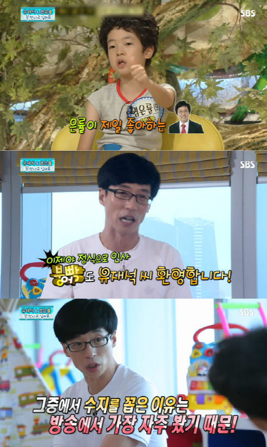 5일 방송된 SBS '스타주니어쇼 붕어빵'(이하 붕어빵)에는 개그맨 염경환의 아들 염은률 군과 유재석의 만남이 전파를 탔다.