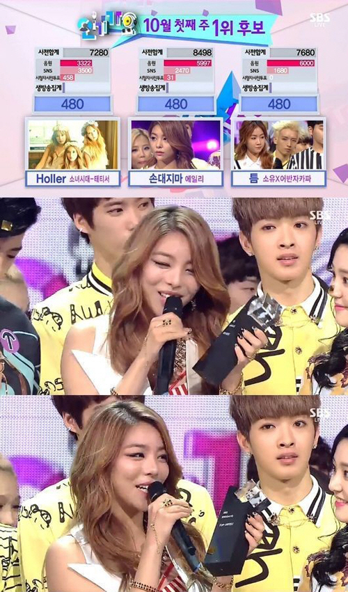 가수 에일리가 '인기가요'에서 신곡 '손대지마'로 1위를 차지했다.
