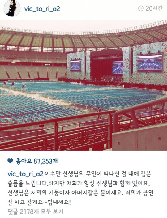 이는 빅토리아가 이수만 대표 부인 별세에 애도를 표하며 공연장 사진을 게재했지만 일부 기사에서 빅토리아가 미소를 짓고 있는 사진이 함께 보도됐기 때문인 것으로 알려졌다.