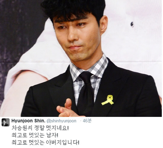 6일 신현준은 자신의 트위터를 통해 "차승원씨 정말 멋지네요! 최고로 멋있는 남자! 최고로 멋있는 아버지입니다!"라는 글을 게재했다.