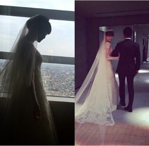 공개된 사진 속 김영아는 새하얀 웨딩드레스를 입은 채, 남편으로 추정되는 턱시도를 입은 남성 옆에 서서 행복한 미소를 짓고 있다.