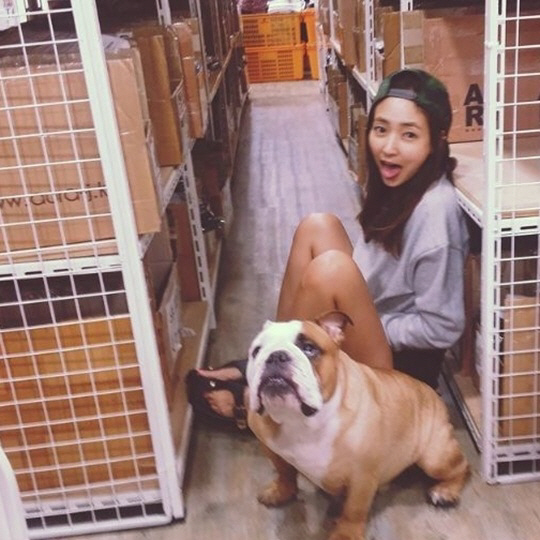공개된 사진 속의 진재영은 강아지와 함께 쇼핑몰 물류창고 바닥에 앉아 있다.