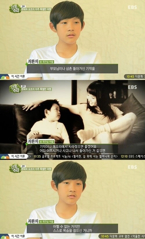 이날 방송에서 최환희는 "인생에서 혹시 지우고 싶은 것이 있냐"는 질문에 "부모님이나 삼촌이 돌아가신 기억을 지우고 싶다"며 고인이 된 최진실, 조성민, 최진영의 죽음에 대한 아픈 상처를 털어놨다.