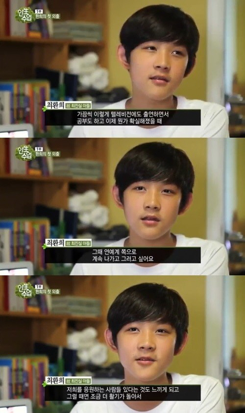 이날 최환희는 제작진과의 인터뷰를 통해 "가끔 방송도 나가고, 공부를 하면서 확실해 지는 게 있다고 느끼면 연예계 쪽으로 나가고 싶다"고 밝혔다.