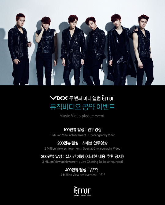 빅스는 오는 14일 자정 두 번째 미니 앨범 'Error(에러)'의 음원과 뮤직비디오 공개를 앞두고 뮤직비디오 100만, 200만, 300만 뷰 달성시 진행될 파격적인 공약 이벤트를 공개해 눈길을 끌고있다.