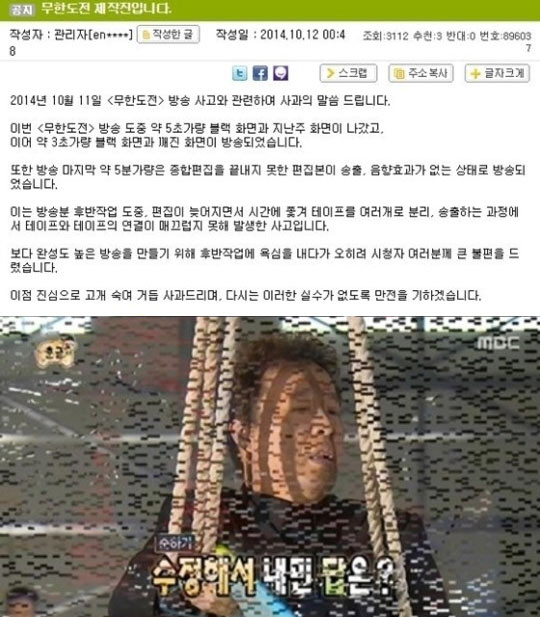 이에 '무한도전' 측은 공식 홈페이지 게시판을 통해 사과의 뜻을 전했다. 제작진은 "지난 11일 무한도전 방송사고와 관련해 사과의 말씀을 드린다"며 "5초가량 블랙 화면과 지난주 화면이 나갔고 이어 약 3초가량 블랙 화면과 깨진 화면이 방송됐다"고 말했다.