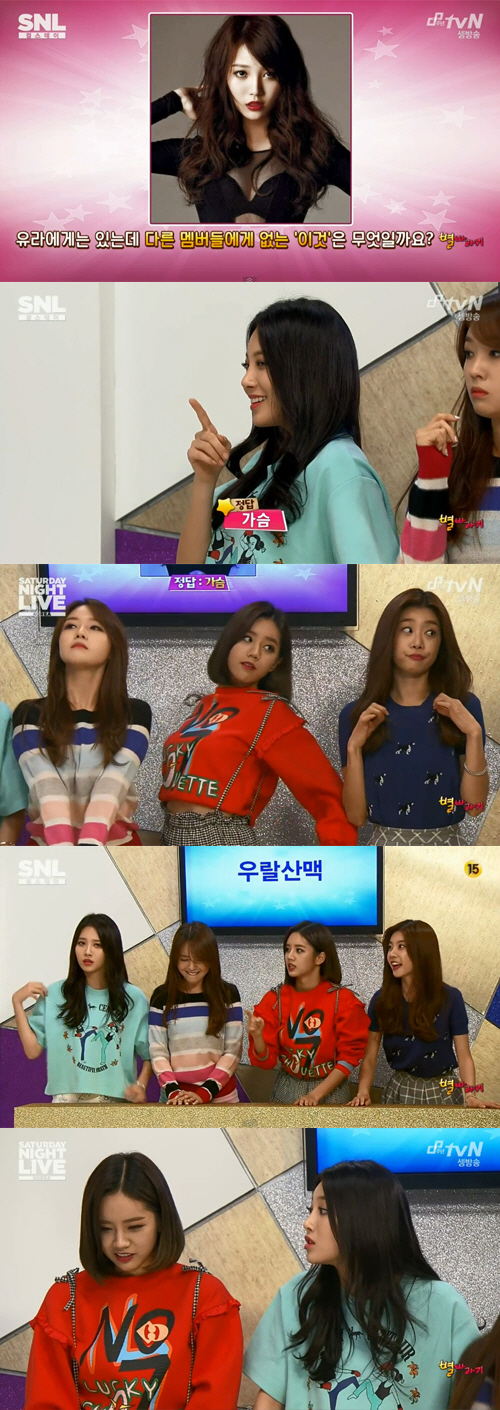 가장 먼저 유라는 "난 귀가 진짜 밝다"며 첫 글자로 자신 있게 '부'를 외쳤다. 유라의 오답에 민아는 차마 이어서 답을 말하지 못 했고, 순서를 바꾼 혜리 역시 민망함에 고개를 숙인 채 웃음만 터뜨렸다.