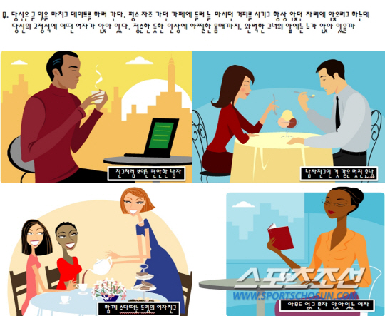 1. 당신은 곧 일을 마치고 데이트를 하러 간다. 평소 자주 가던 카페에 들러 늘 마시던 커피를 시키고 항상 앉던 자리에 앉으려고 하는데 당신의 고정석에 어떤 여자가 앉아 있다. 청순한 듯한 인상에 아찔한 몸매까지. 완벽한 그녀의 앞에는 누가 앉아 있을까?