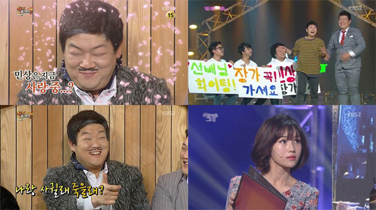 이날 노우진은 유민상에 대해 "바보스러울 정도로 한 여자만 바라보는 순정파"라며 "나이트클럽에서 부킹을 해도 꽉 물고 놔주지를 않는다. 심지어 남자친구가 있어도 저 여자다 싶으면 꽉 물고 놔주지를 않는다"고 유민상의 사생활을 폭로했다. 이어 "최근에 문 여자는 신인 개그우먼 홍예슬이다"라고 밝혔고, 유민상은 당황한 기색을 감추지 못 했다.