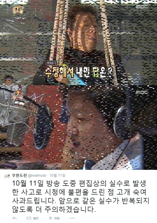 제작진은 "이번 '무한도전' 방송 도중 약 5초 동안 블랙 화면과 지난주 장면이 나갔고, 이어 3초가량 블랙 화면과 깨진 화면이 방송됐다"고 밝혔다.