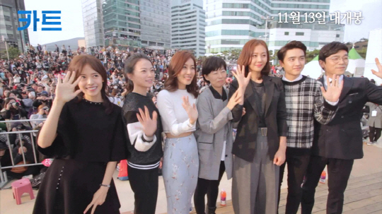다음 달 13일로 개봉을 확정한 '카트'는 대형마트 비정규직 노동자들의 실화를 다룬 작품으로 관심을 모은다. 벌써부터 '작품이 좋다'는 입소문이 퍼지면서 눈길을 끄는 '카트'는 수학 여행비를 벌기 위해 아르바이트를 하는 아들을 둔 엄마 선희(염정아)와 아이의 어린이 집 시간에 맞춰 매일 칼퇴근을 할 수밖에 없는 혜미(문정희), 능글맞게 청소원 아주머니들과 농담을 주고 받지만 업무의 일환으로 그들을 해고시켜야 하는 입장이 되는 동준(김강우)의 이야기를 그리고 있다. 염정아 문정희 김영애 김강우 천우희 등 연기로 소문난 배우들의 '명품 연기'가 기대를 모으는 가운데 작품의 감동코드가 관객들을 얼마나 울릴 수 있을지가 성공의 관건이다.