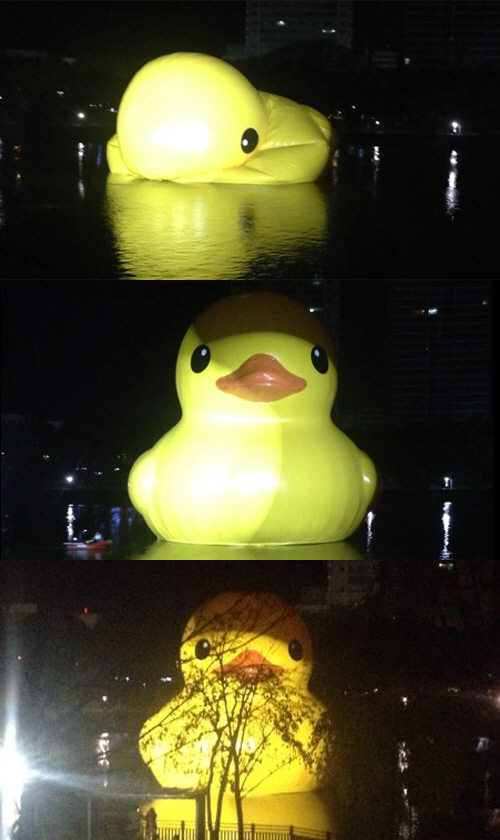 사진에는 물 위에서 점차 자신의 모습을 찾고 강한 조명까지 받으며 깜찍한 자태를 뽐내고 있는 '러버 덕'의 모습이 담겨 있다.