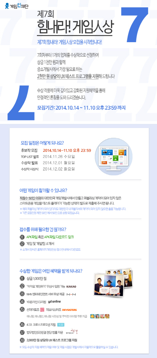 우선 게임 개발의 형태와 게임 장르가 다양화되는 추세를 반영해, 직원수 30인 이하 중소 개발사에 한정했던 접수 자격을 50인 이하 게임 개발사도 참가 가능하도록 자격 조건을 완화했다. 또 매회 2개 작품을 선정하던 수상작을 회당 1개 작품 수상으로 변경하지만, 최종 선정될 1개 수상작에는 1000만원 상당의 UI(사용자 환경 설계)와 UX(사용자 경험) 테스트를 추가 제공한다. 수상업체는 UI/UX테스트를 통해 게임의 완성도를 높이고, 시장 반응을 미리 살펴볼 수 있게 된다.