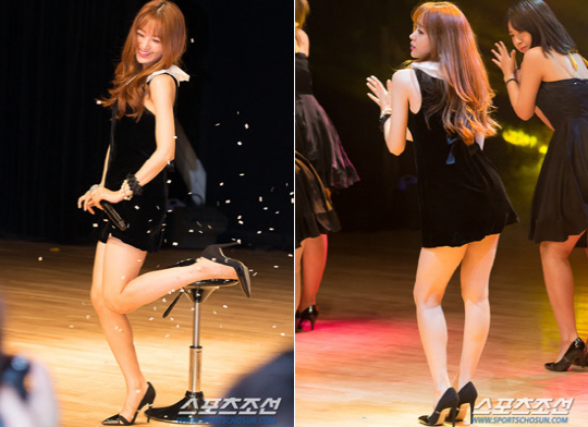 블랙 미니원피스에 여성스러운 웨이브 헤어를 늘어뜨린 송지은은 이날 매끈한 각선미를 강조하는 안무를 선보여 시선을 사로잡았다.