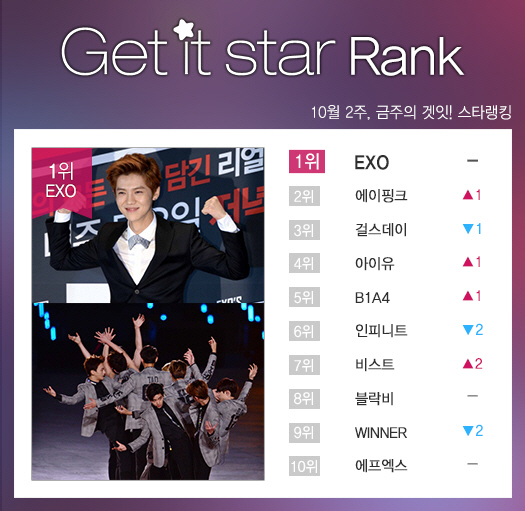 겟잇스타 랭킹 2014년 10월 2주 차에도 선두는 바뀌지 않았습니다. EXO가 여전히 최정상의 위치를 수성하고 있는데요, 지난주, 멤버 루한의 탈퇴 논란으로 많은 사람들의 구설수에 오르기도 했던 EXO이기에 이 순위가 더욱 인상적입니다