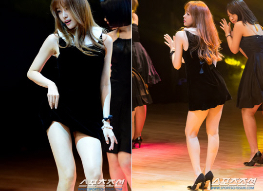 블랙 미니원피스에 여성스러운 웨이브 헤어를 늘어뜨린 송지은은 이날 매끈한 각선미를 강조하는 안무를 선보여 시선을 사로잡았다.