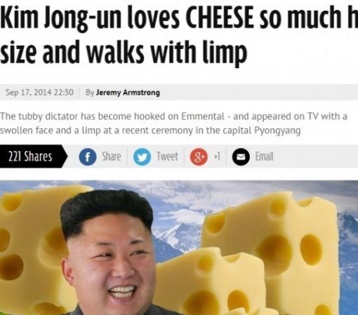 더불어 최근 '데일리미러'는 김정은의 노동당 창건기념식과 최고인민회의 불참에 대해 "스위스산 에멘탈 치즈를 너무 많이 먹어서 체중이 불어났기 때문"이라며 건강 이상설을 주장한 바 있다. 에멘탈치즈의 칼로리는 닭 가슴살 한 덩이 정도의 무게인 100g에 255kcal다.