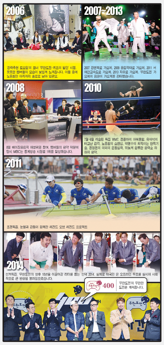 "한 주 한 주 열심히 하다보니 400회가 됐네요. 시작할 때만 해도 400회가 올 줄은 상상도 못했어요."(유재석) 대한민국 예능 역사에 한 획을 그은 MBC '무한도전'이 18일에 방송 400회를 맞이합니다. 2005년 4월 '토요일'이란 버라이어티 프로그램의 한 코너 '무모한 도전'으로 출발, 그해 10월 '강력추천 토요일'의 '무리한 도전'을 거쳐 2006년 5월 '무한도전'이란 타이틀로 독립해 오늘에 이르렀습니다. 황소와 줄다리기, 지하철과 달리기, 목욕탕 물 채우기, 소방차와 불끄기 대결 등 '무모'하고 '무리'한 도전을 하던 초창기가 새삼 떠오릅니다. 당시엔 '무한도전'이 9년 넘게 방송될 거라 예상한 이들은 아무도 없었지요. 김태호 PD는 "초창기에 초라한 시청률에도 '아직 가능성이 있다'는 평가를 해주신 시청자들 덕분에 버틸 수 있었다"며 "'무한도전' 400회의 가장 큰 공로자는 시청자들"이라고 고마움을 전했습니다. 아직도 무한한 도전을 하고 있는 '무한도전'의 400회를 축하하며 기억에 남는 순간들을 꼽아봤습니다.