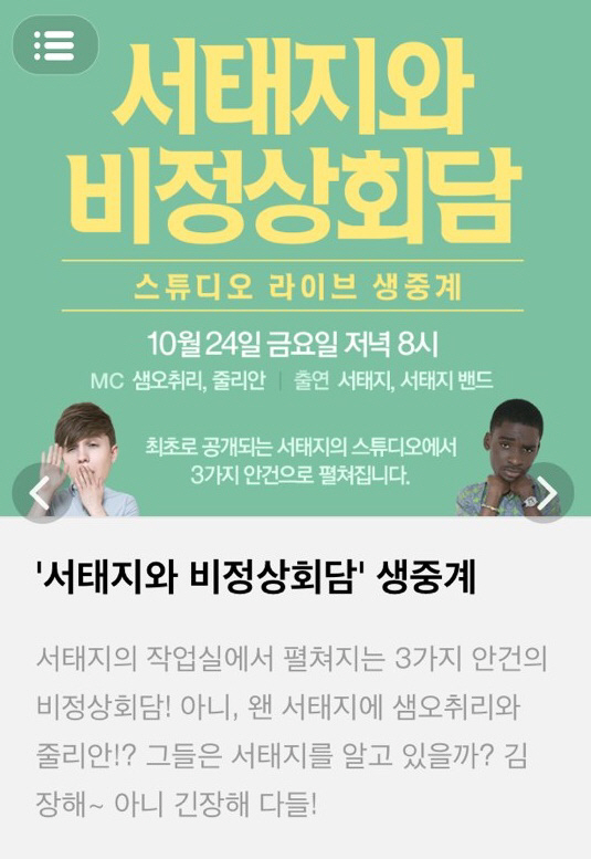 카카오뮤직 스튜디오 라이브는 샘 오취리, 줄리안이 출연하고 있는 '비정상회담'의 포맷을 일부 빌려 진행될 전망이다. 이를 위해 카카오뮤직은 방송에 참여 할 20명의 카톡 대표를 선발할 예정이며, 아울러 서태지의 역대 명곡을 선정하는 투표를 함께 진행한다.