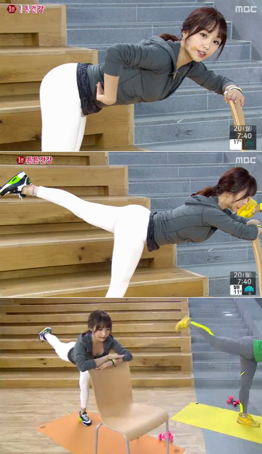 박초롱은 20일 오전 방송된 MBC '뉴스투데이-1분 튼튼건강'에서 '힙업·고관절 강화 동작'을 선보였다. 이 동작은 '힙업·고관절 강화 운동'은 힙업과 동시에 고관절 주변 근육을 균형 있게 발달시켜주며, 의자 등받이 앞에 서서 쉽게 할 수 있다.