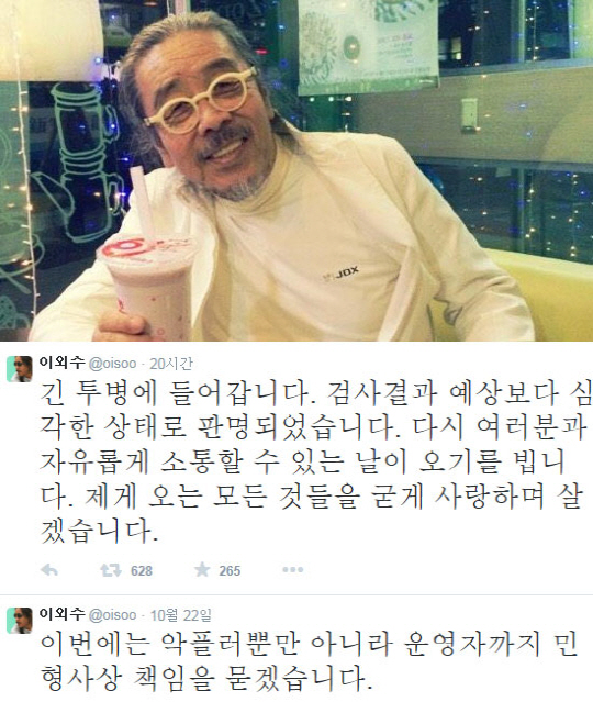 이후 다음날인 23일 이외수는 자신의 트위터에 "긴 투병에 들어갑니다. 검사결과 예상보다 심각한 상태로 판명되었습니다"라며, "다시 여러분과 자유롭게 소통할 수 있는 날이 오기를 빕니다. 제게 오는 모든 것들을 굳게 사랑하며 살겠습니다"라고 덧붙였다.