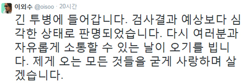 앞서 이외수는 자신의 SNS에 "긴 투병에 들어갑니다. 검사결과 예상보다 심각한 상태로 판명되었습니다. 다시 여러분과 자유롭게 소통할 수 있는 날이 오기를 빕니다. 제게 오는 모든 것들을 굳게 사랑하며 살겠습니다"라는 글을 남겼다.