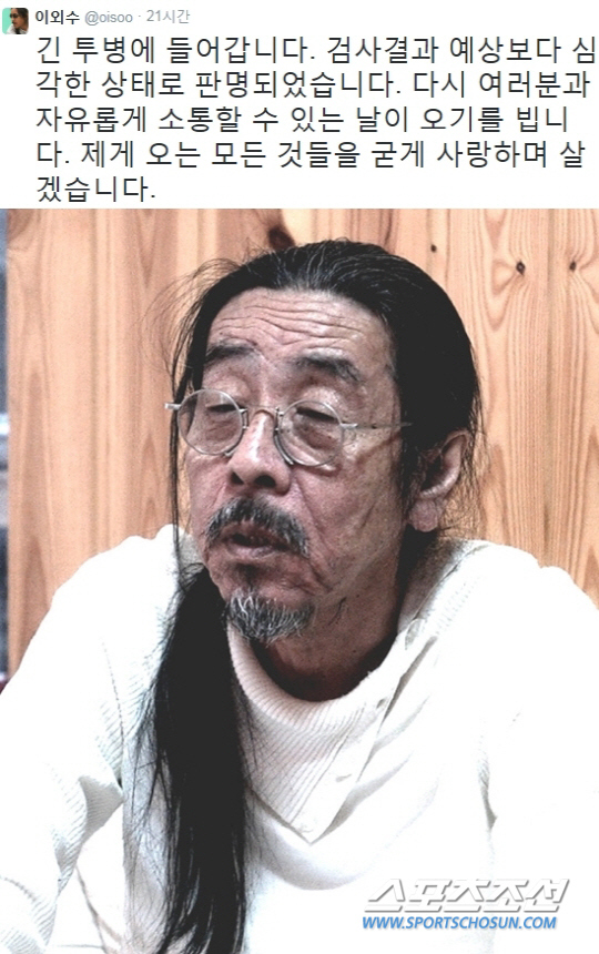 지난 22일 오후 이외수는 자신의 트위터 계정를 통해 "긴 투병에 들어갑니다. 검사결과 예상보다 심각한 상태로 판명됐습니다"라고 운을 뗐다.