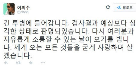 이외수는 이날 자신의 트위터를 통해 "긴 투병에 들어갑니다. 검사결과 예상보다 심각한 상태로 판명되었습니다. 다시 여러분과 자유롭게 소통할 수 있는 날이 오기를 빕니다. 제게 오는 모든 것들을 굳게 사랑하며 살겠습니다"라고 자신의 투병 사실을 알렸다.