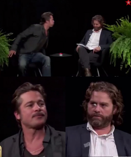 질문마다 표정 관리를 하며 대답하던 브래트 피트는 막판에 참지 못하고 씹고 있던 껌을 갈리피아나키스의 얼굴에 뱉었고 껌은 눈 아래에 정통으로 붙었다.