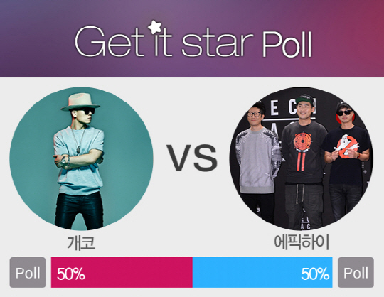 스타 스타일 매거진 어플리케이션 '겟잇스타'의 'Get it Star POLL' 의 122번째 대결은 '힙합스타' 개코 vs 에픽하이의 대결입니다. 122번째 대결을 소개하기에 앞서, 지난주부터 진행된 악역 대결의 결과를 알아볼까요? 이유리(87%)가 정웅인(13%)을 큰 차이로 따돌리고 최고의 악역으로 선정됐습니다. 역시 연민정! 역시 '왔다 장보리'의 인기가 대단했었음을 다시금 깨닫게 되는 결과였습니다.