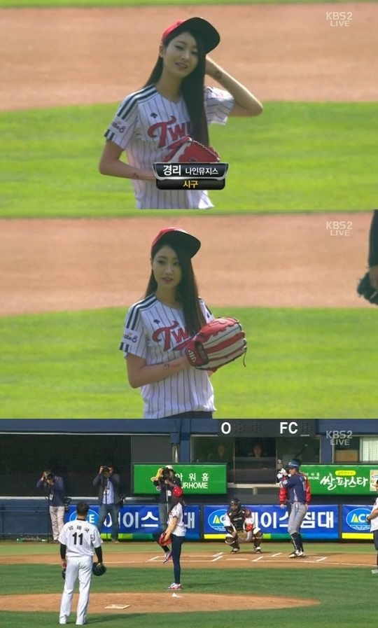 이날 경리는 LG 유니폼에 청바지를 매치해 탄탄한 각선미를 뽐냈다.
