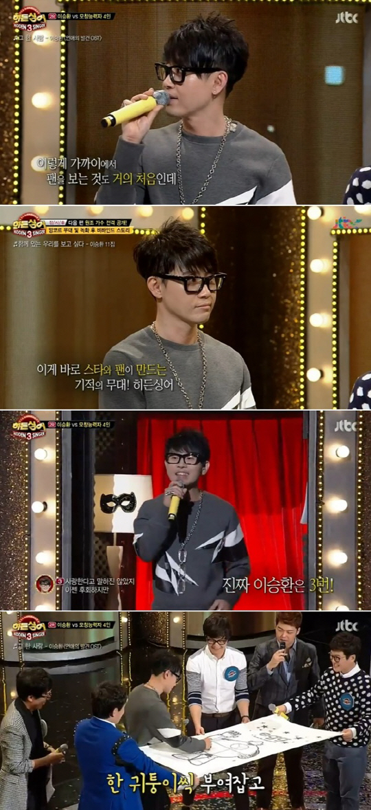 '히든싱어' 최초로 MR이 아닌 밴드 연주에 맞춰 전곡을 소화했으며, 히든싱어로 자리한 참가자들과의 끈끈한 유대로 큰 감동을 선사했다. 특히 이날 '히든싱어'에서는 객석에 자리한 판정단까지 한 마음이 돼 이승환을 위한 깜짝 이벤트를 선물해 감동을 줬다.