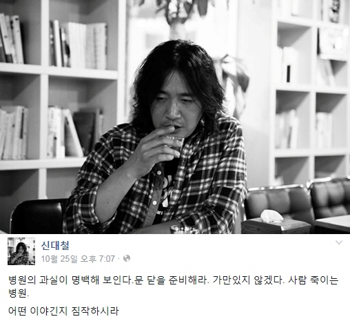 신대철은 지난 25일 자신의 페이스북에 "병원의 과실이 명백해 보인다. 문 닫을 준비해라. 가만있지 않겠다. 사람 죽이는 병원. 어떤 이야긴지 짐작하시라"라며 분노를 표출했다.
