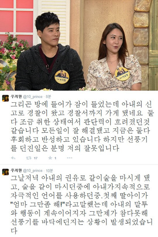또 "그리곤 방에 들어가 잠이 들었는데 아내의 신고로 경찰이 왔고 경찰서까지 가게 됐다. 둘 다 조금 취한 상태여서 판단력이 흐려졌던 것 같다 모든 일이 잘 해결됐고 지금은 둘 다 후회하고 반성하고 있다"며 "하지만 선풍기를 던진 일은 분명 저의 잘못이다. 공인으로서 해서는 안 될 일을 했다. 그 점은 다시 한 번 머리 숙여 사죄드린다. 걱정 끼쳐드려 정말 죄송하다. 앞으로 더욱 성숙하고 성실한 모습 보여드릴 수 있도록 노력하겠다"고 거듭 사과했다.