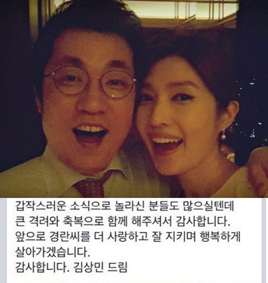 많은 네티즌들은 김경란 김상민 결혼 소식에 "김경란 김상민 결혼, 정말 행복하시겠어요", "김경란 김상민 결혼, 정말 불같은 사랑을 하셨나봐요", "김경란 김상민 결혼, 속도위반은 아니었군요", "김경란 김상민 결혼, 두 분이 참 좋아 보이네요"등의 반응을 보이고 있다. <스포츠조선닷컴>