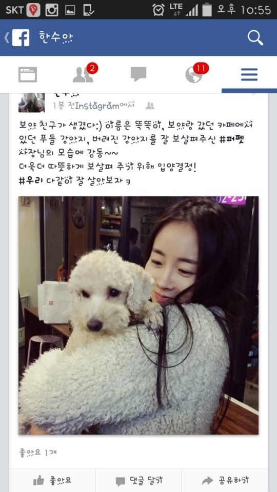 한수아는 29일 '보야 친구가 생겼다. 이름은 똑똑이, 보야랑 갔던 카페에 있던 푸들 강아지. 버려진 강아지를 잘 보살펴주신 사장님의 모습에 감동~~ 더욱더 따뜻하게 보살펴주기 위해 입양결정! 우리 다같이 잘 살아보자'라는 글과 함께 강아지 '보야'와 찍은 사진을 게재했다.