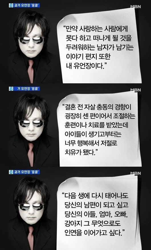당시 신해철은 "만약 사랑하는 사람에게 못 다하고 떠나게 될 것을 두려워하는 남자가 남기는 이야기 편지 또한 내 유언장이다"라며 "집안 친척 중 급사한 분들이 몇 있는데 갑자기 돌아가신 분 같은 경우 가족들에게 마지막 작별인사를 못 한다"라고 유언장을 작성하는 이유를 밝혔다.