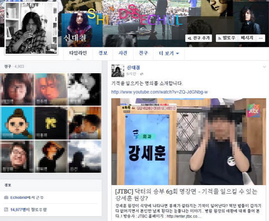 28일 신대철은 자신의 페이스북에 "기적을 일으키는 명의를 소개합니다"는 글과 함께 JTBC '닥터의 승부'에 출연한 강세훈 원장의 동영상을 링크했다.
