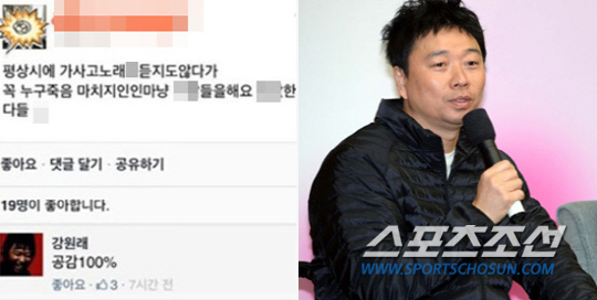 해당 사진에는 한 네티즌이 자신의 페이스북에 "평상시에 가사고 노래 듣지도 않다가 꼭 누구 죽으면 마치 지인인 마냥 XX들을 해요. XX한다들"이라고 남긴 글이 보인다. 이 글에 강원래가 "공감 100%"라는 댓글을 남긴 것.