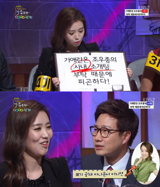 KBS 아나운서 가애란이 선배 아나운서 조우종이 후배 이지연 아나운서를 좋아한다고 폭로했다.