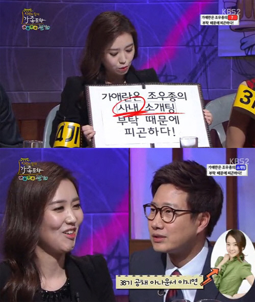 이날 가애란은 "조우종의 사내 소개팅 부탁 때문에 피곤하다"고 말문을 열었다. 이어 "나한테 와서 KBS 후배 좀 소개시켜달라고 자꾸 이야기한다"며 "후배 소개팅 자리를 직접 마련해달라고도 했다. 그래서 직접 얘기하면 되지 않냐고 했더니 부끄러움이 많다고 하더라"고 이야기해 현장을 폭소케 했다.