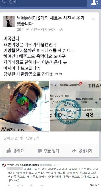 앞서 팝핀현준은 미국 로스앤젤레스 출국을 앞둔 지난달 16일 자신의 페이스북에 "미국 간다. 이번 여행은 아시아나(항공) 협찬인데 이왕 협찬해줄 거면 비지니스(클래스)를 해주지. 하여간 해주고도 욕먹어요. 으이구, 자리 배정도 안 해놔서 2층 가운데. 아시아나 보고 있나? 담부턴 대한항공으로 간다"라는 글을 올렸다.