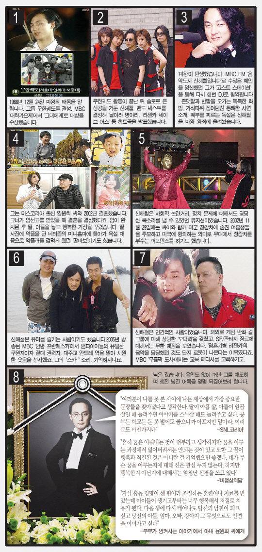 '마왕' 신해철이 27일 오후 8시 19분 가족들이 지켜보는 가운데 저산소 허혈성 뇌손상으로 세상을 떠났습니다. 향년 46세. 17일 장 협착증 수술을 받고 퇴원했으나 통증을 호소해 재입원, 22일 혼수 상태에 빠진지 5일 만에 벌어진 일이었습니다. 그의 빈소가 마련된 서울 송파구 아산병원 장례식장 23호에는 만 여명에 달하는 조문객이 몰려 가요계의 비극에 함께 아파했습니다. 90년대를 상징하는 뮤지션으로서 대한민국 록의 대중화를 이뤄낸 '마왕' 신해철. 님은 갔지마는 우리는 님을 보내지 아니하였습니다.