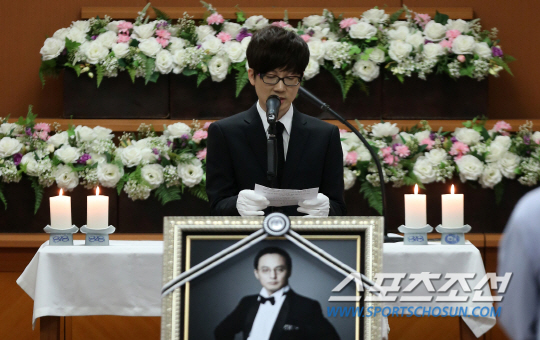故 신해철의 발인식이 31일 서울 풍납동 서울아산병원 장례식장에서 엄수됐다. 신해철은 지난 17일 장 협착증 수술을 받은 후 퇴원했으나 20일 새벽 응급실로 이송됐다. 이후 22일 오후 2시쯤 서울아산병원 응급실에 혼수상태로 내원해 응급수술을 포함한 최선을 치료를 했으나 27일 가족이지켜보는 가운데 저산소 허혈성 뇌손상으로 사망했다. 故 신해철의 유해는 서울추모공원에서 화장한 뒤 그가 생전 사용했던 분당 수내동의 음악 작업실에 잠시 머무른 후 안성 유토피아 추모관에 안치될 예정이다. 사진은 발인식 전 진행된 영결식에서 추도사를 전하는 서태지의 모습. 허상욱 기자 wook@sportschosun.com/2014.10.31/