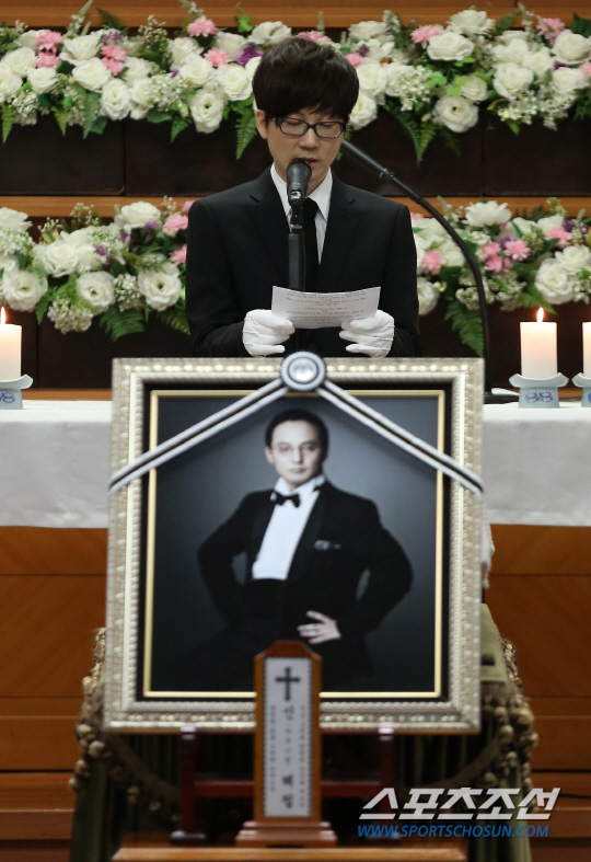 故 신해철의 발인식이 31일 서울 풍납동 서울아산병원 장례식장에서 엄수됐다. 신해철은 지난 17일 장 협착증 수술을 받은 후 퇴원했으나 20일 새벽 응급실로 이송됐다. 이후 22일 오후 2시쯤 서울아산병원 응급실에 혼수상태로 내원해 응급수술을 포함한 최선을 치료를 했으나 27일 가족이지켜보는 가운데 저산소 허혈성 뇌손상으로 사망했다. 故 신해철의 유해는 서울추모공원에서 화장한 뒤 그가 생전 사용했던 분당 수내동의 음악 작업실에 잠시 머무른 후 안성 유토피아 추모관에 안치될 예정이다. 사진은 발인식 전 진행된 영결식에서 추도사를 전하는 서태지의 모습. 허상욱 기자 wook@sportschosun.com/2014.10.31/