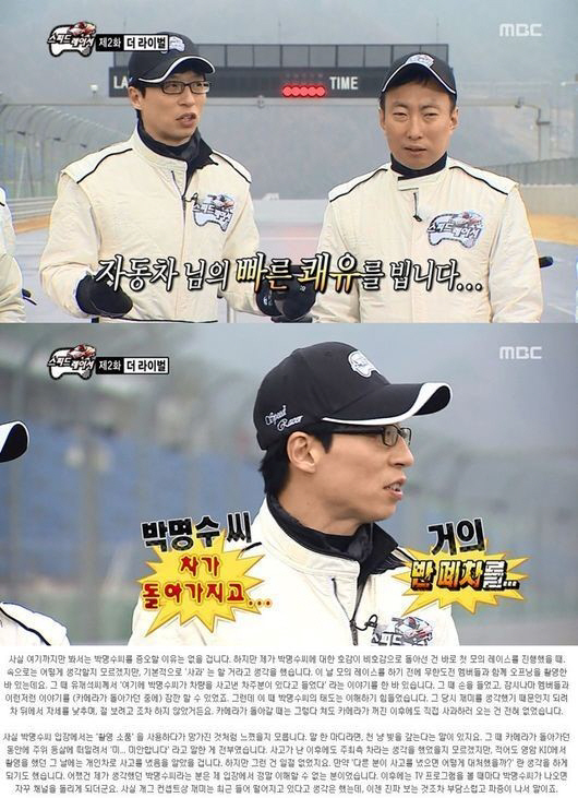하지만 차주가 불만을 토로한 부분은 사고를 낸 박명수의 태도였다. 차주는 "적어도 박명수씨가 첫 모의 레이스를 하는 오프닝 촬영에서 사과할 것이라 생각했다. 그러나 박명수씨는 재미를 생각해서인지는 몰라도 날 보려 하지도 않았고, 카메라가 꺼진 후에도 직접 사과하러 오지 않았다"며 "박명수씨 입장에서는 촬영 소품을 사용하다가 망가진 것처럼 느꼈을지 모른다. 주위 등살에 떠밀려서 '미... 미안합니다' 라고 말한 게 전부였다. 사고가 난 이후에도 주최 측 차라는 생각을 했었을지 모르겠지만, 적어도 영암 KIC에서 촬영을 했던 그날에는 개인차로 사고를 냈다는 사실을 알았을 것"이라며 설명했다.