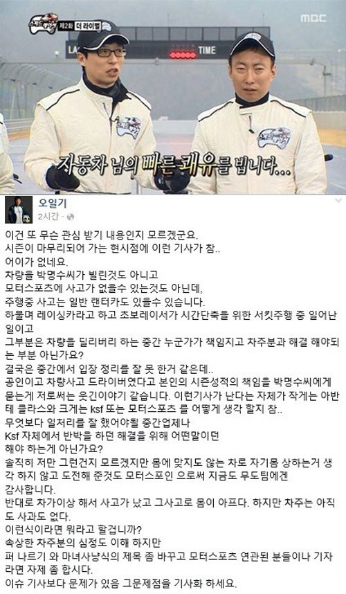 또한 오일기 카레이서는 "저만 그런 건지 모르겠지만, 몸에 맞지도 않는 차로 자기 몸 상하는거 생각 하지 않고 도전해 준 것도 모터스포츠인으로서 '무한도전' 팀에겐 감사하고 있다"라며 "반대로 차가 이상해서 사고가 났고 그 사고로 몸이 아프다. 하지만 차주는 아직도 사과도 없다. 이런 식이라면 뭐라고 할 거냐"라고 덧붙였다.
